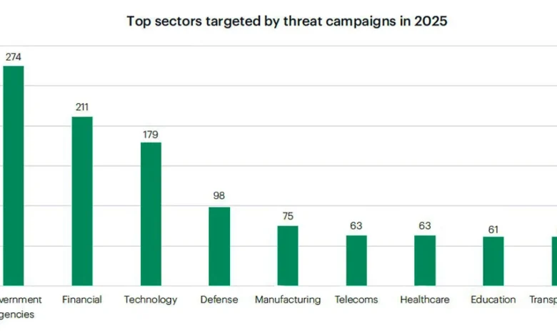 Entre os setores analisados, o governamental liderou com 274 campanhas, seguido pelo financeiro (211) e tecnologia (179). Defesa registrou 98 ocorrências, enquanto manufatura somou 75. Os dados mostram que os atacantes concentraram esforços em segmentos ligados à infraestrutura crítica, dados sensíveis e estabilidade econômica, embora praticamente nenhum setor tenha ficado imune.